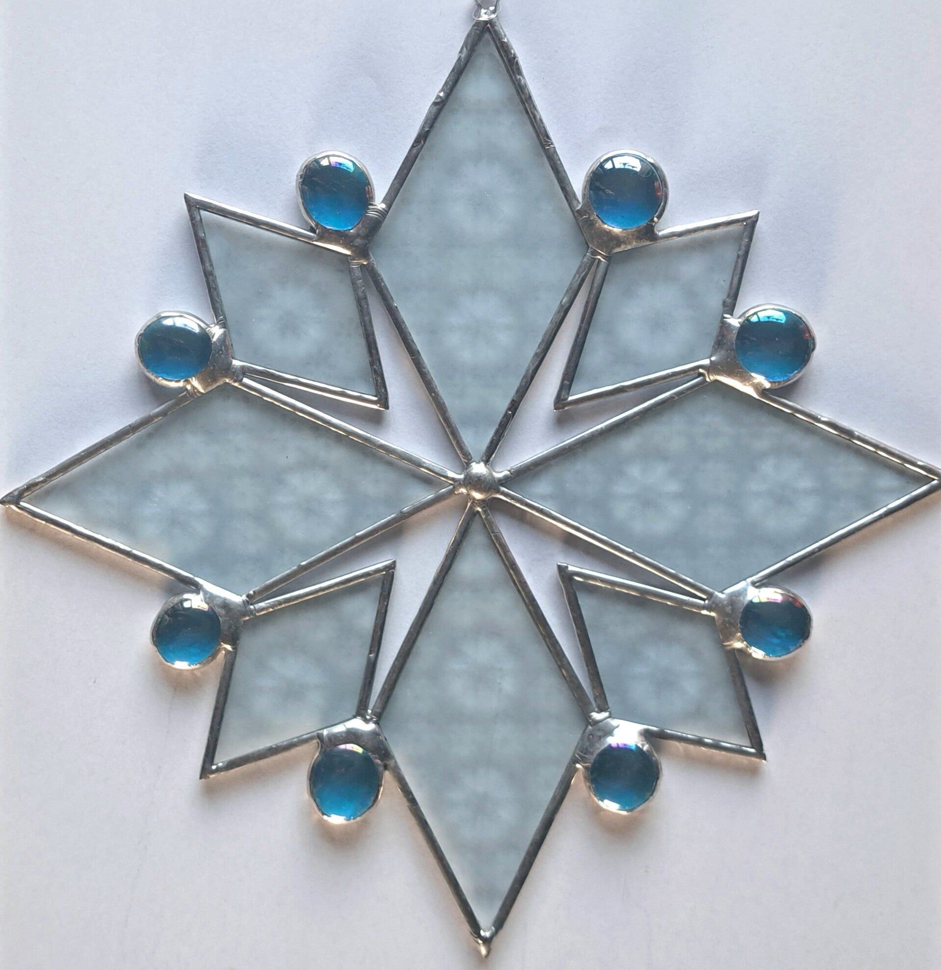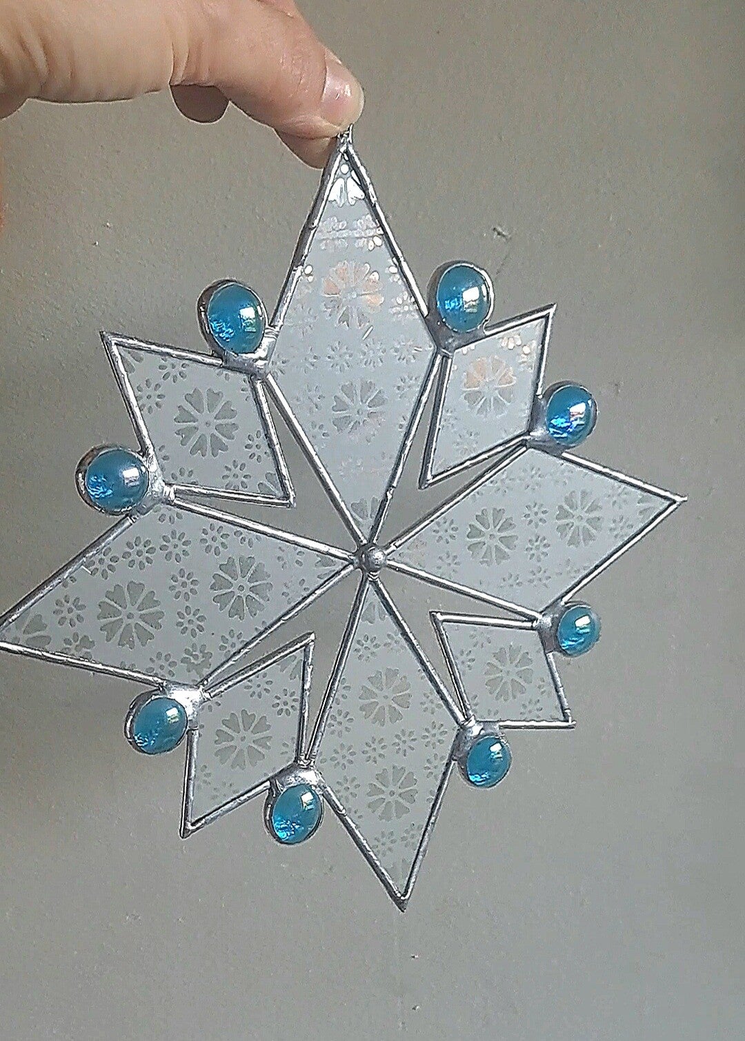 Rond de sneeuvlok schitteren blauwe glas nuggets, die het licht vangen en een betoverend kleurenspel geven bij elke zonnestraal.