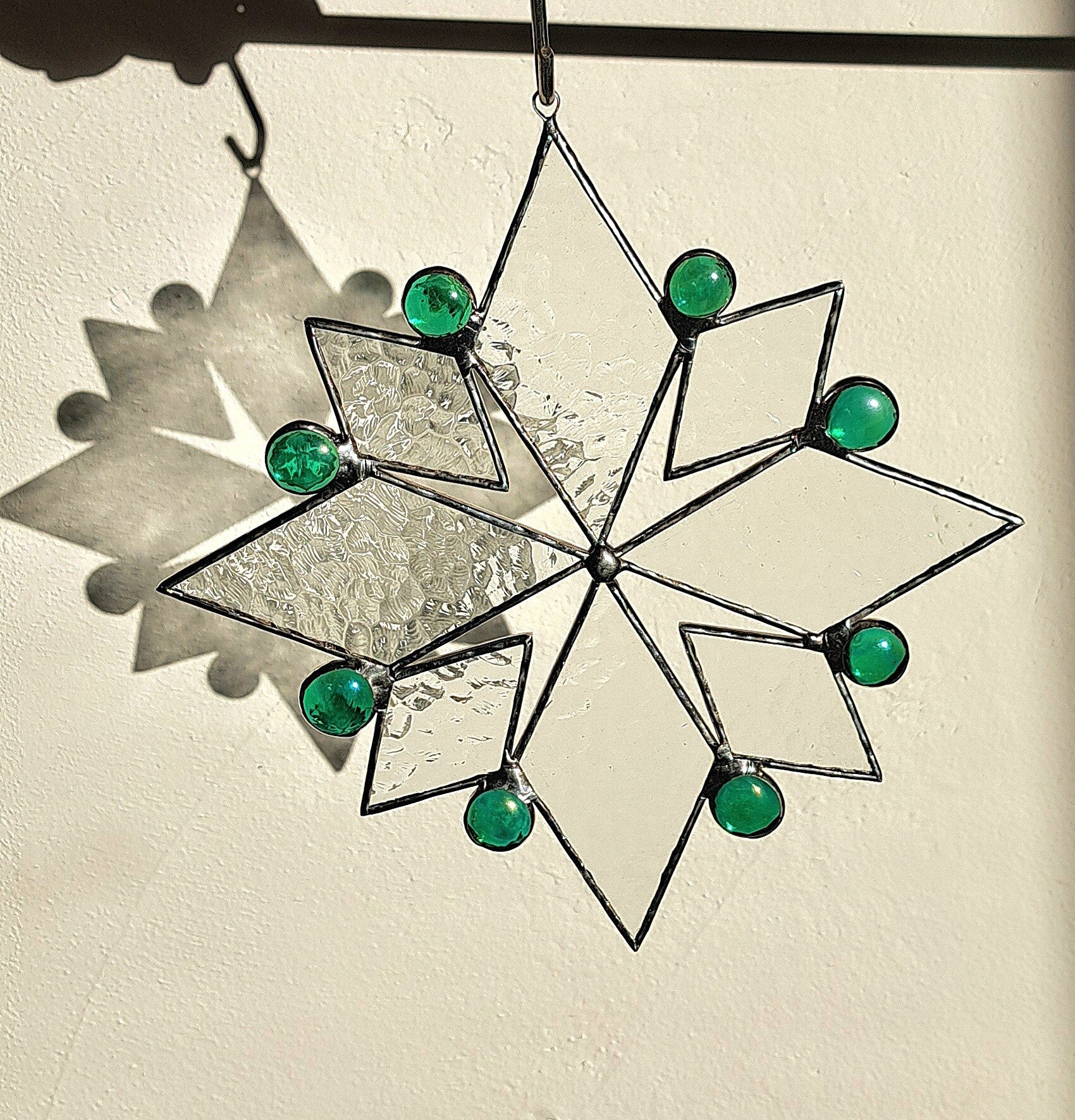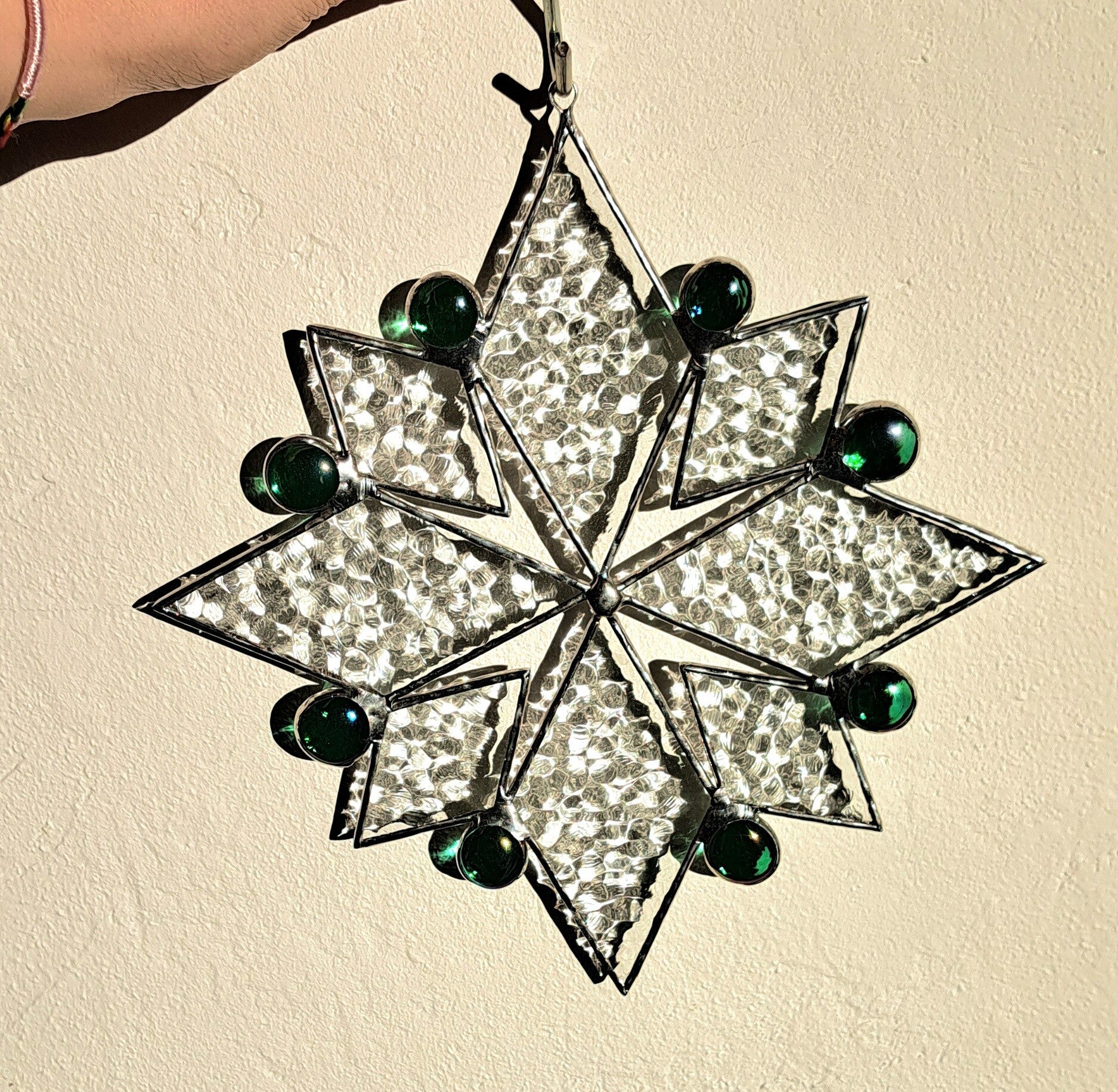 Rond de sneeuvlok schitteren groene glas nuggets, die het licht vangen en een betoverend kleurenspel geven bij elke zonnestraal.