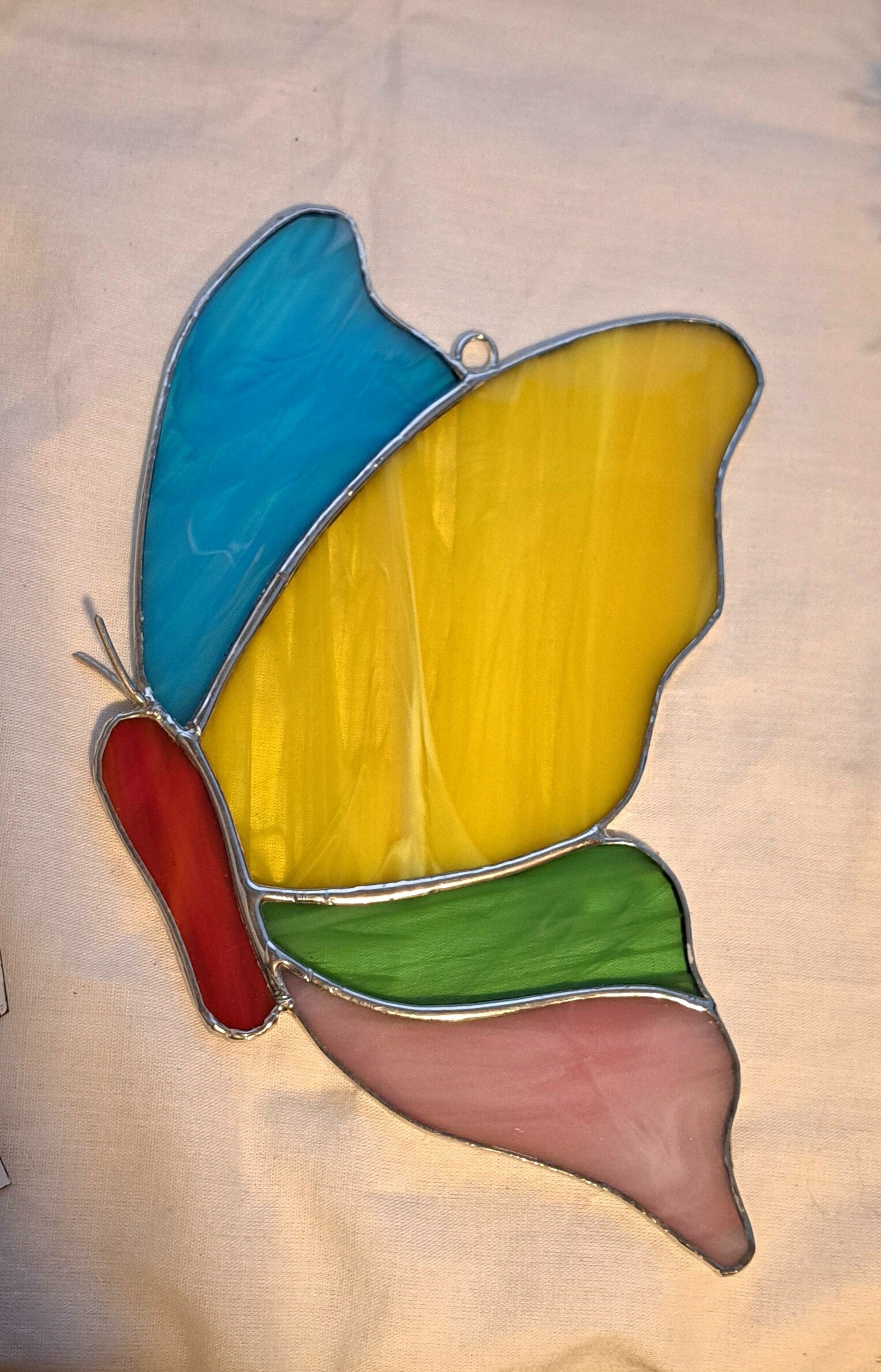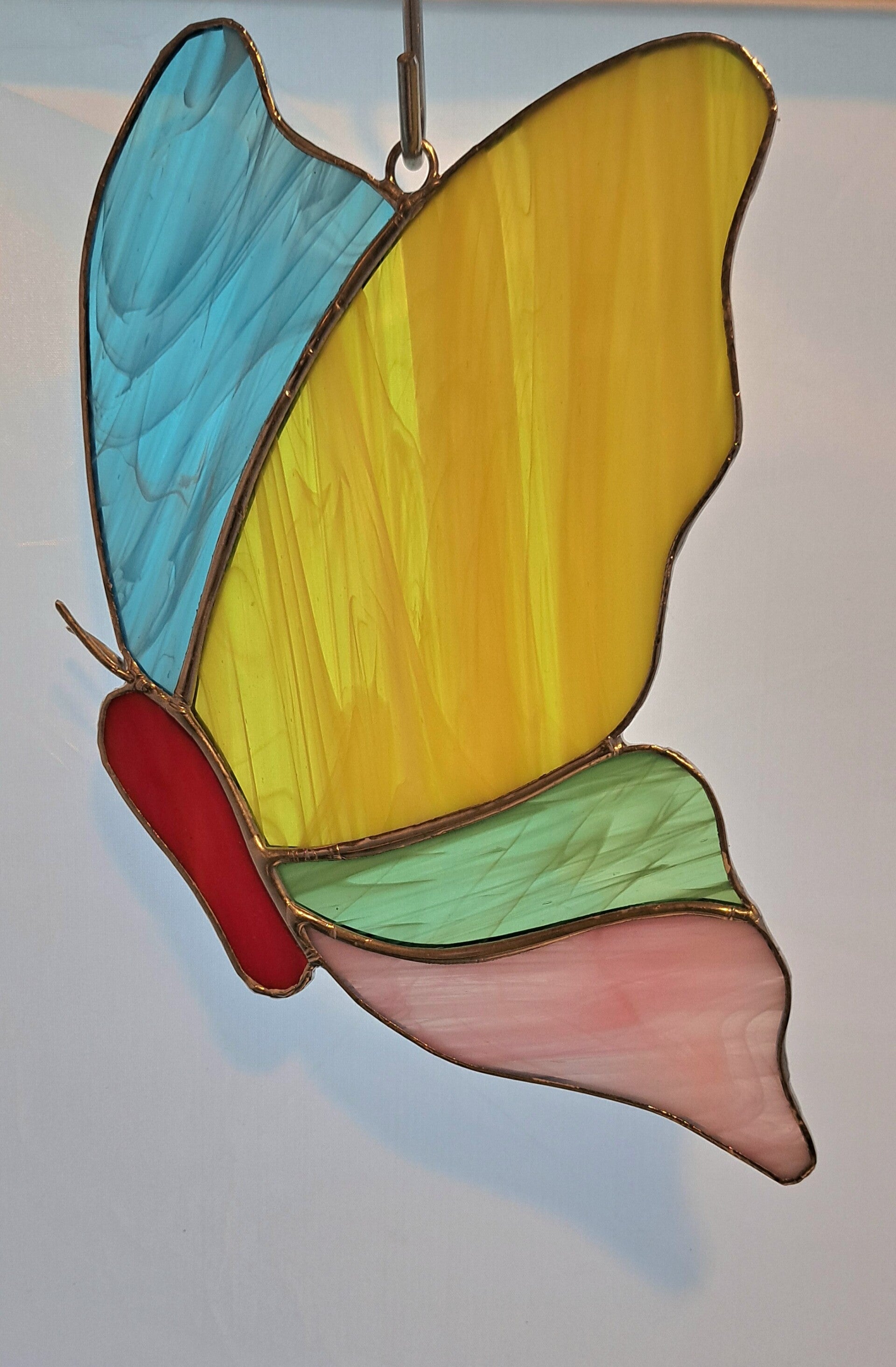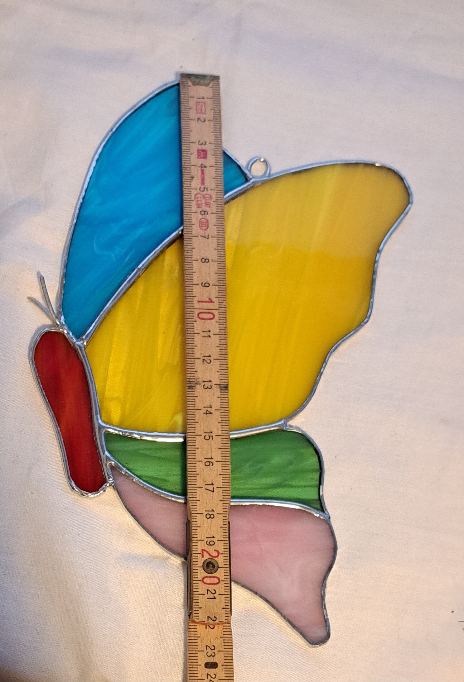 De vleugels bestaan uit prachtig gemarmerd glas in helder geel, zachtblauw, pastelgroen en warm roze tinten. Wanneer het licht erdoorheen valt, komt de vlinder echt tot leven en ontstaat een betoverend kleurspel. De rode accenten geven het ontwerp extra karakter en maken het geheel helemaal af.