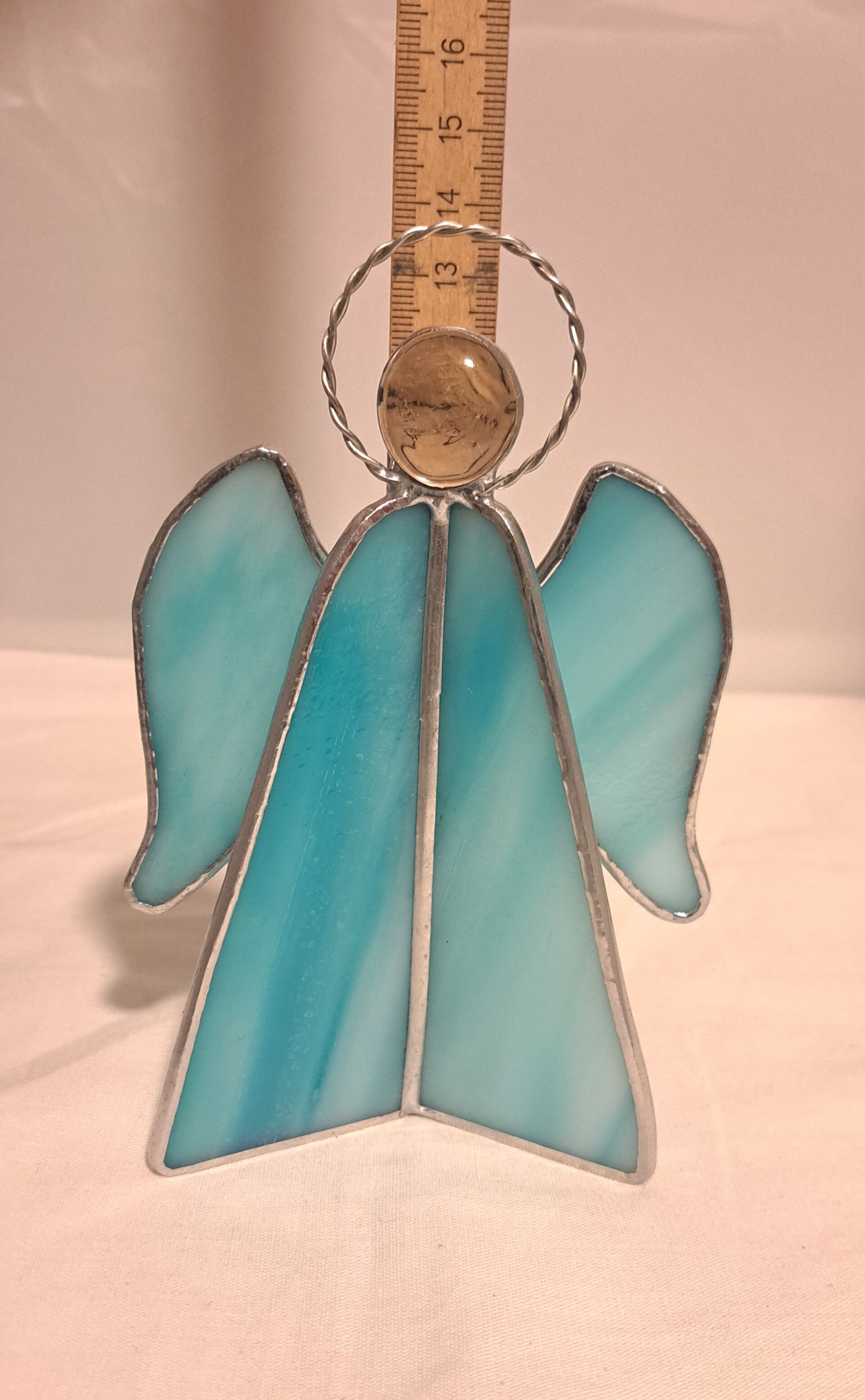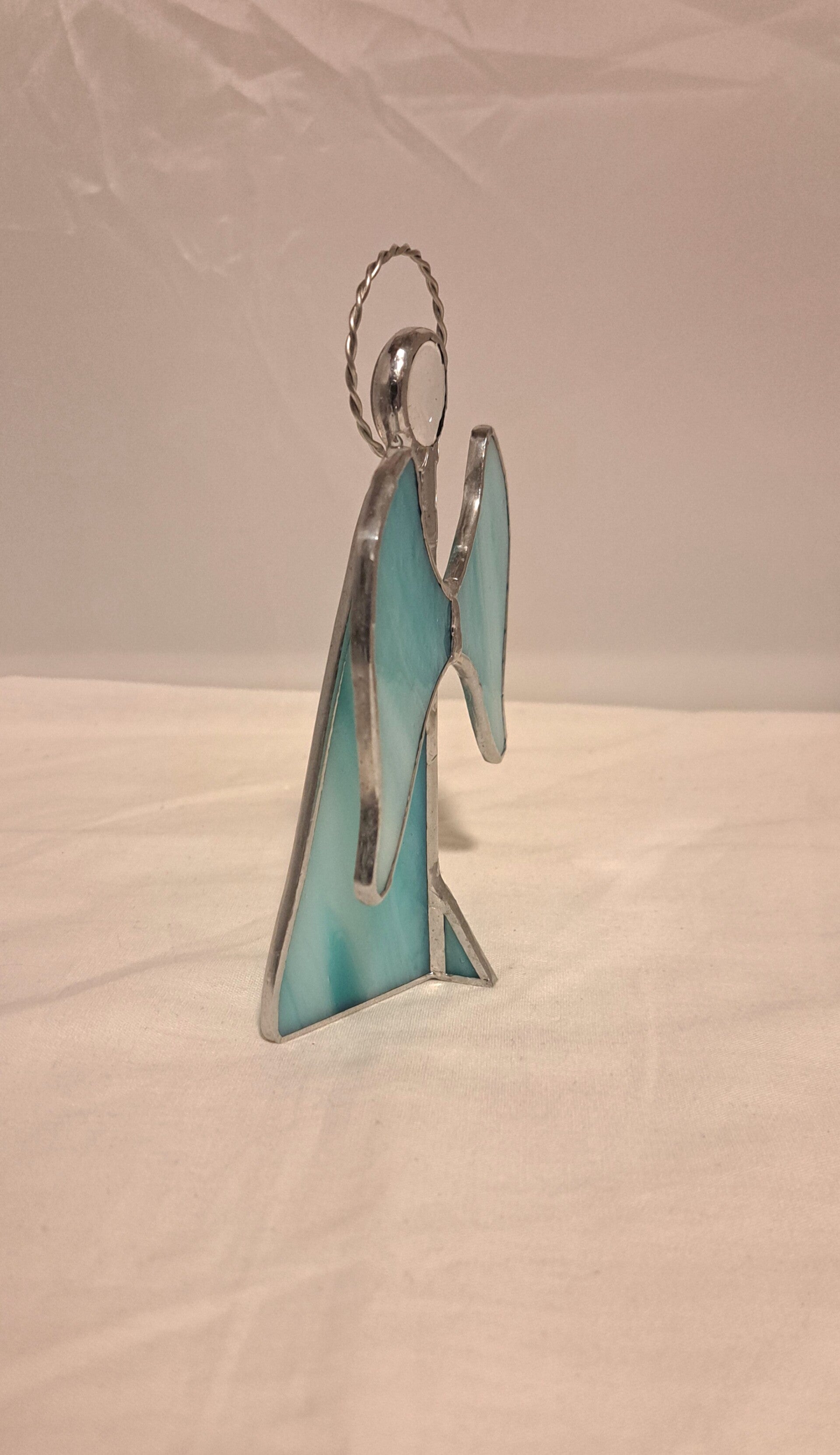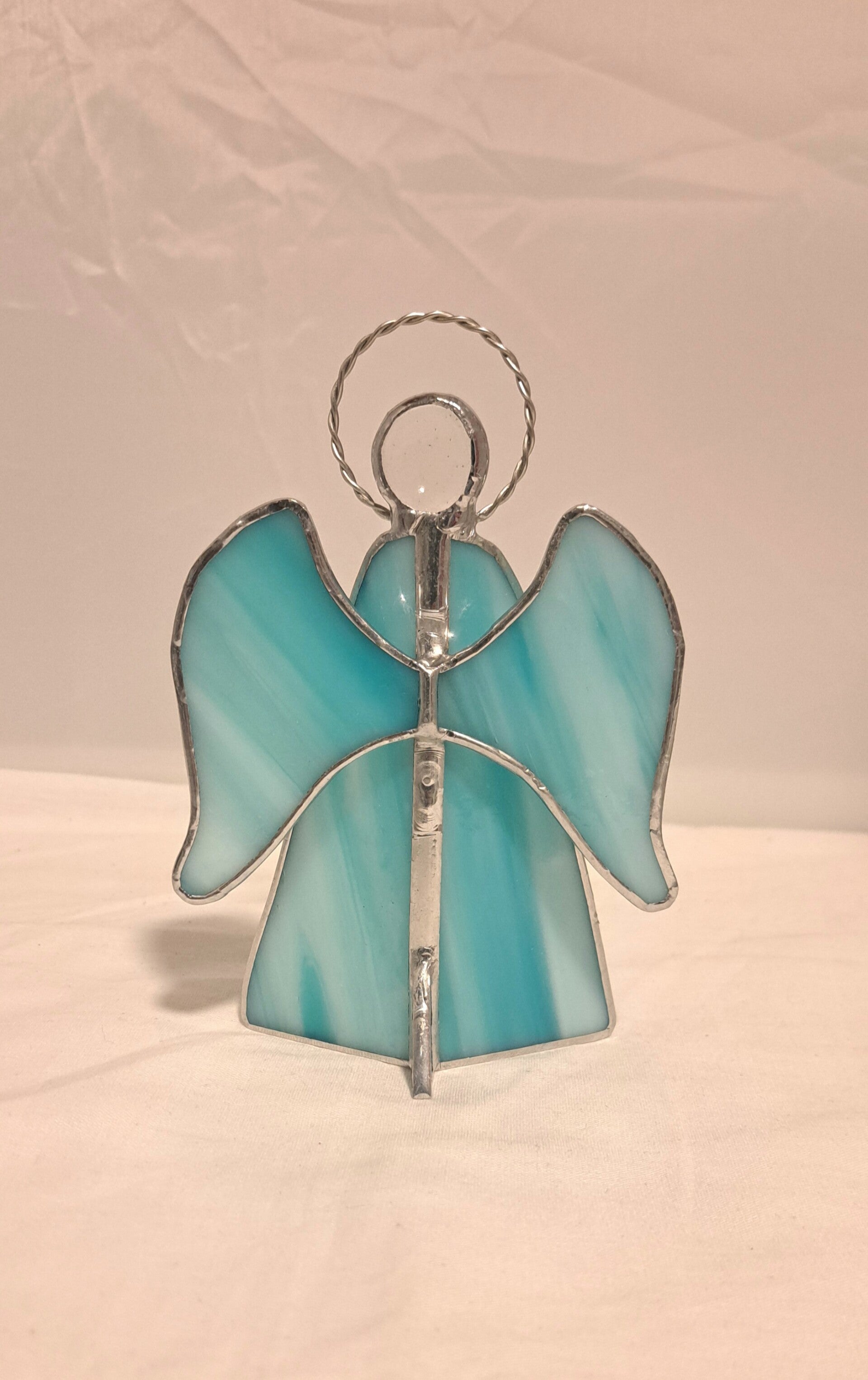 Breng een serene en sfeervolle touch in je interieur met dit handgemaakte engeltje van schitterend blauw glas. In Tiffany-techniek vervaardigd, straalt dit unieke stuk pure ambacht uit. Het engeltje heeft zacht gemarmerde vleugels en een prachtig glanzend lijfje, waardoor het licht er subtiel doorheen speelt. Het hoofdje bestaat uit een heldere glas-nugget, omringd door een zorgvuldig gedraaid aureool van vertind koperdraad.