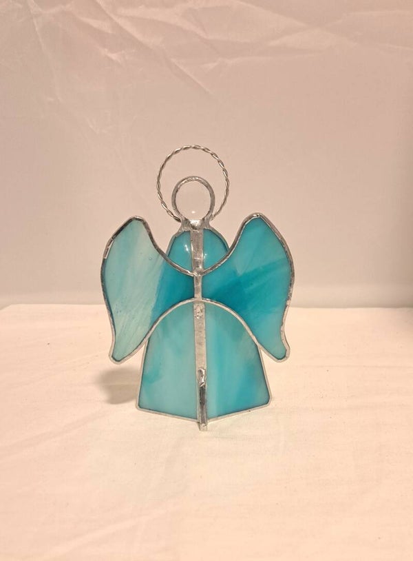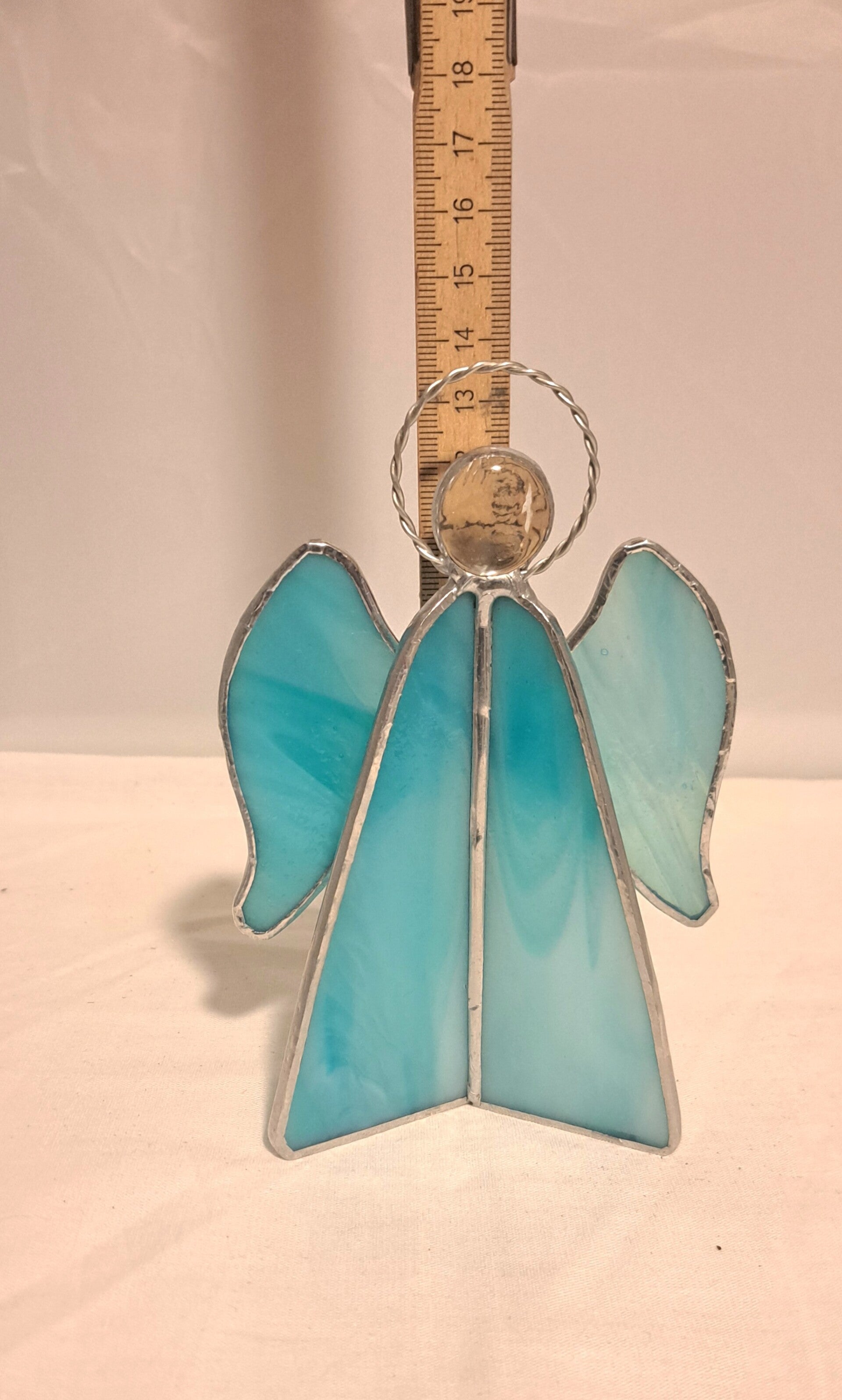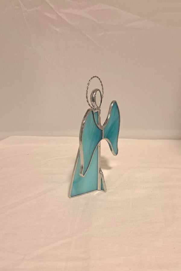 Breng een serene en sfeervolle touch in je interieur met dit handgemaakte engeltje van schitterend blauw glas. In Tiffany-techniek vervaardigd, straalt dit unieke stuk pure ambacht uit. Het engeltje heeft zacht gemarmerde vleugels en een prachtig glanzend lijfje, waardoor het licht er subtiel doorheen speelt. Het hoofdje bestaat uit een heldere glas-nugget, omringd door een zorgvuldig gedraaid aureool van vertind koperdraad.