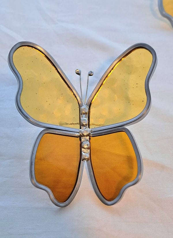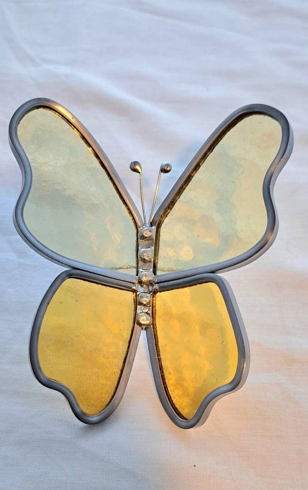 Prachtige handgemaakte vlinder van glas in mooie licht en donker gele tinten. De vlinder is gemaakt met randlood en heeft sierlijke voelsprietjes van vertint koperdraad.