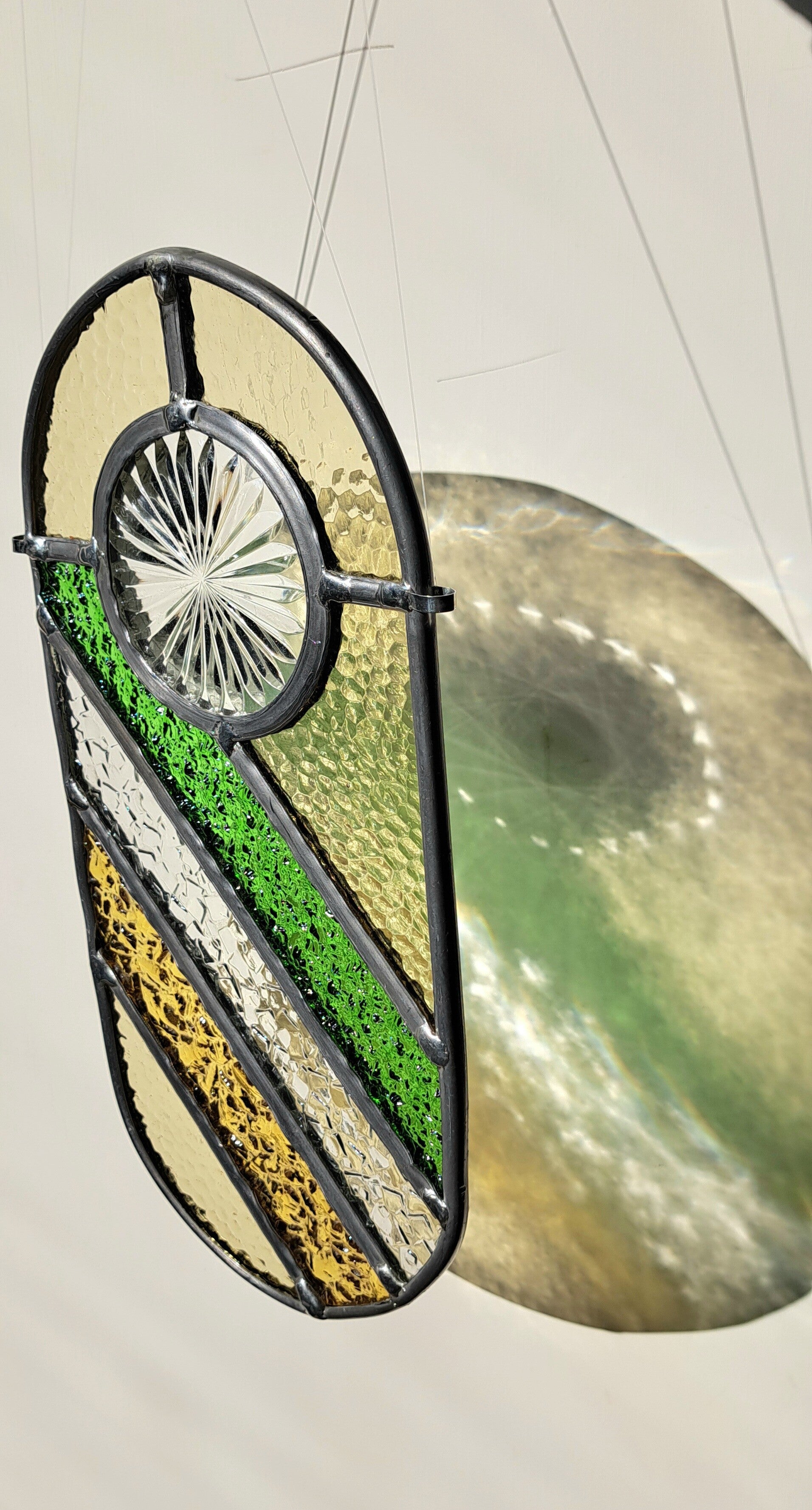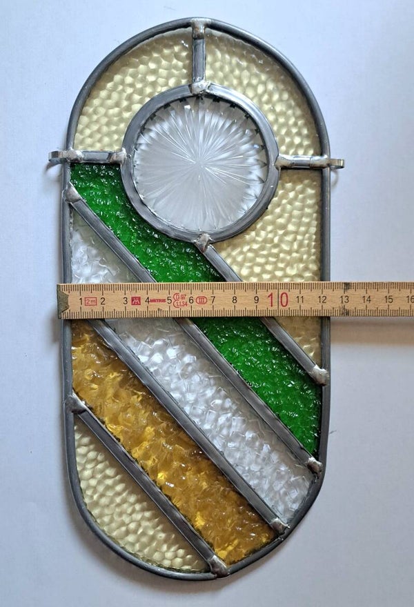 Unieke handgemaakte glas-in-lood raamhanger in een elegante ovale vorm met een modern en speels lijnenspel.