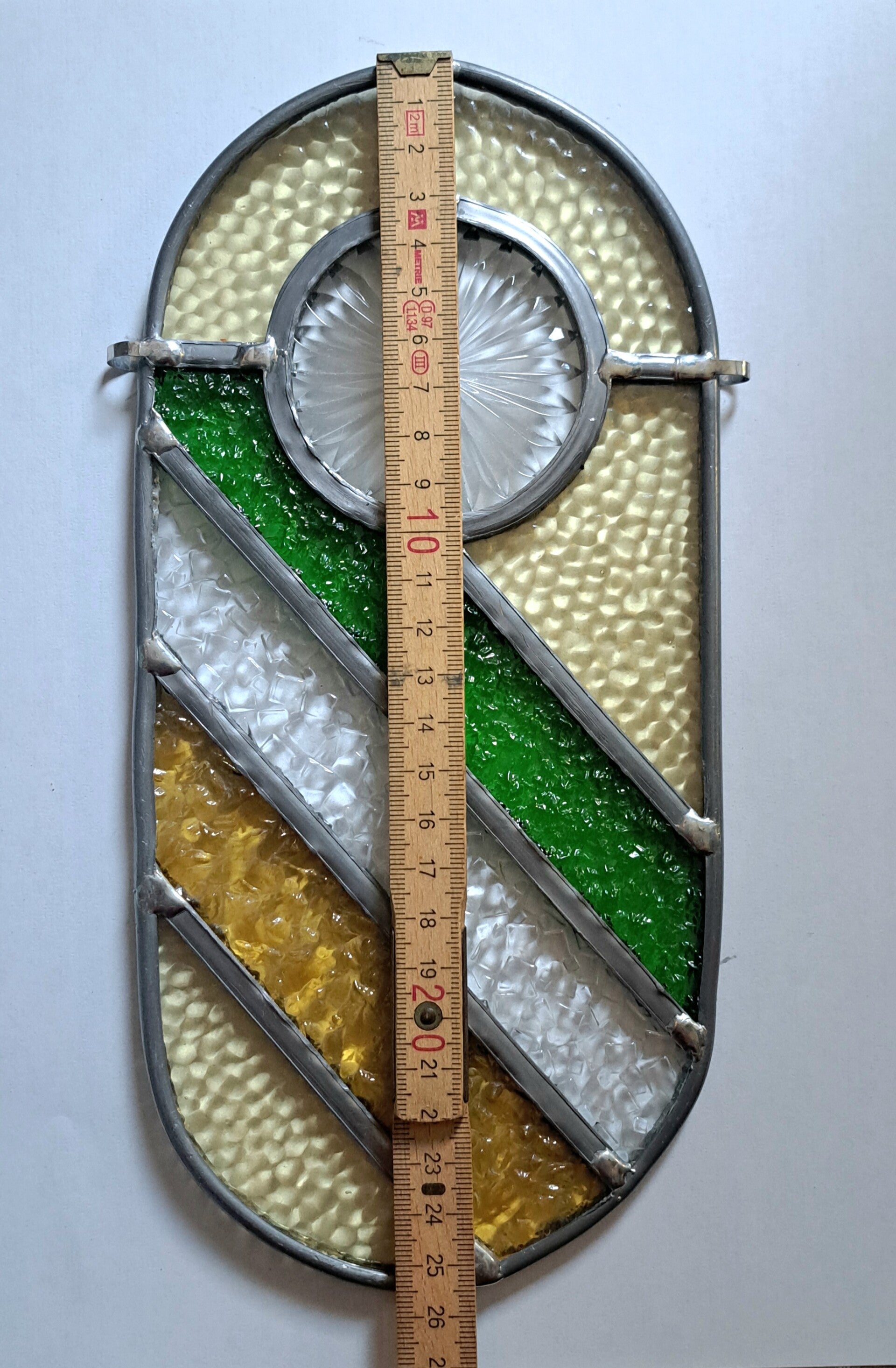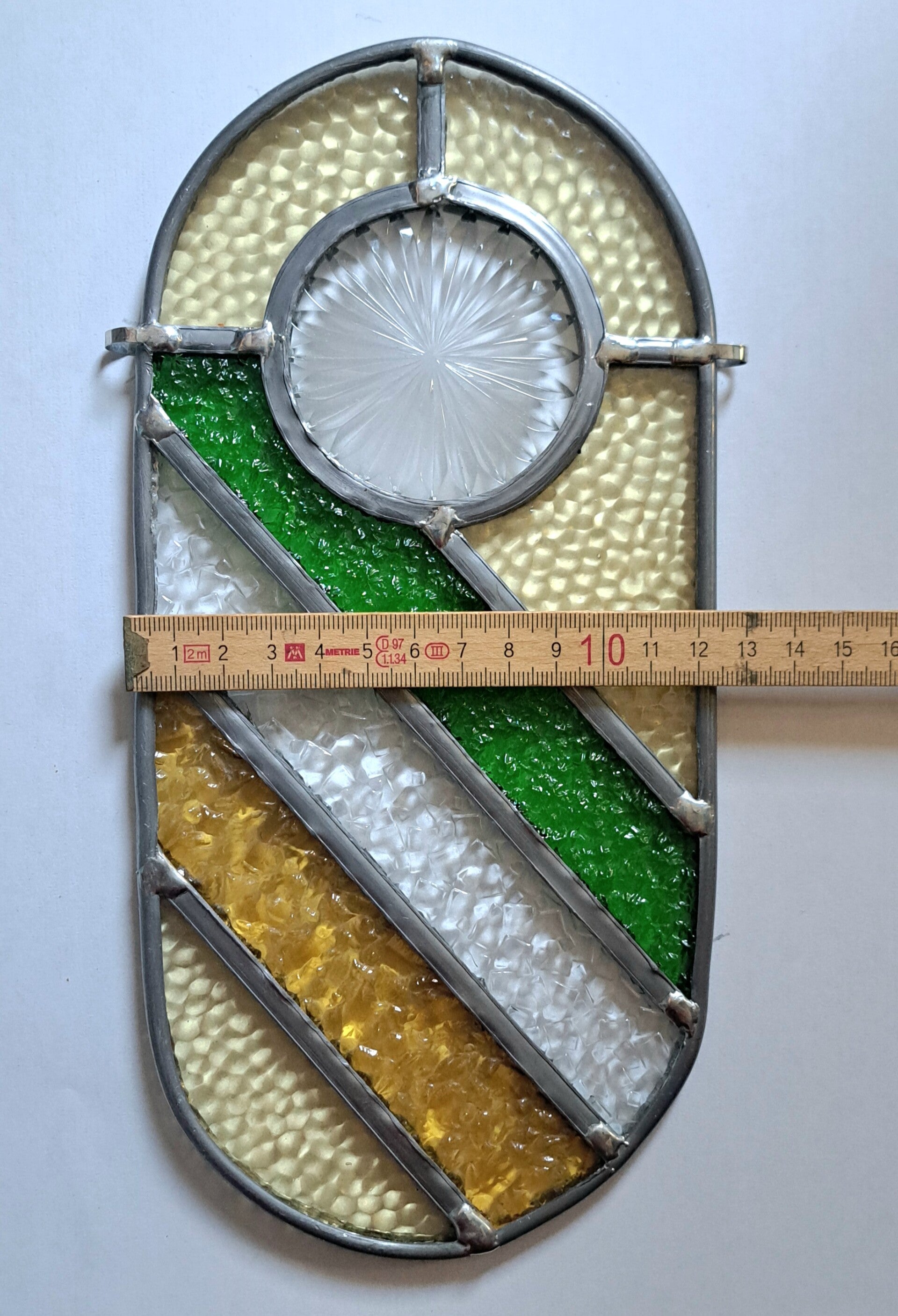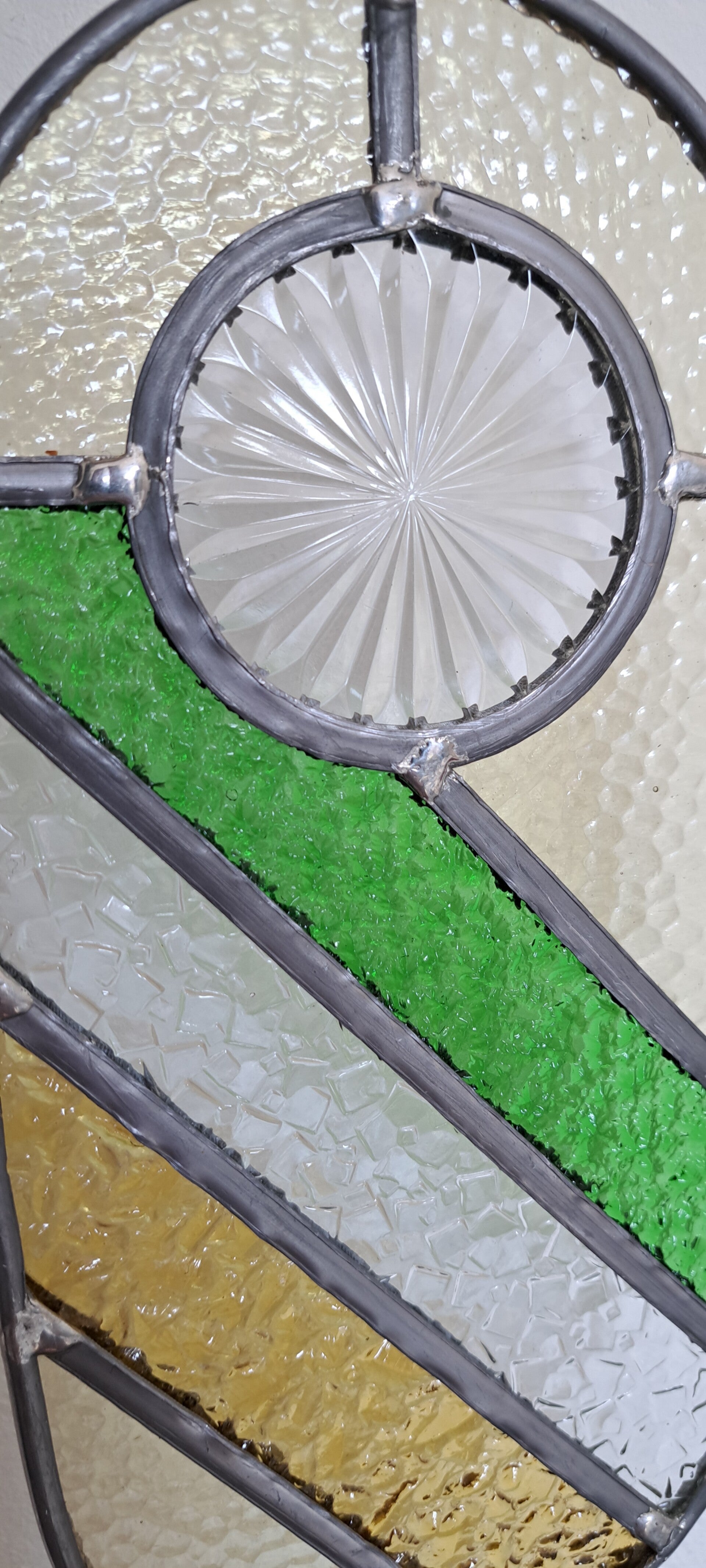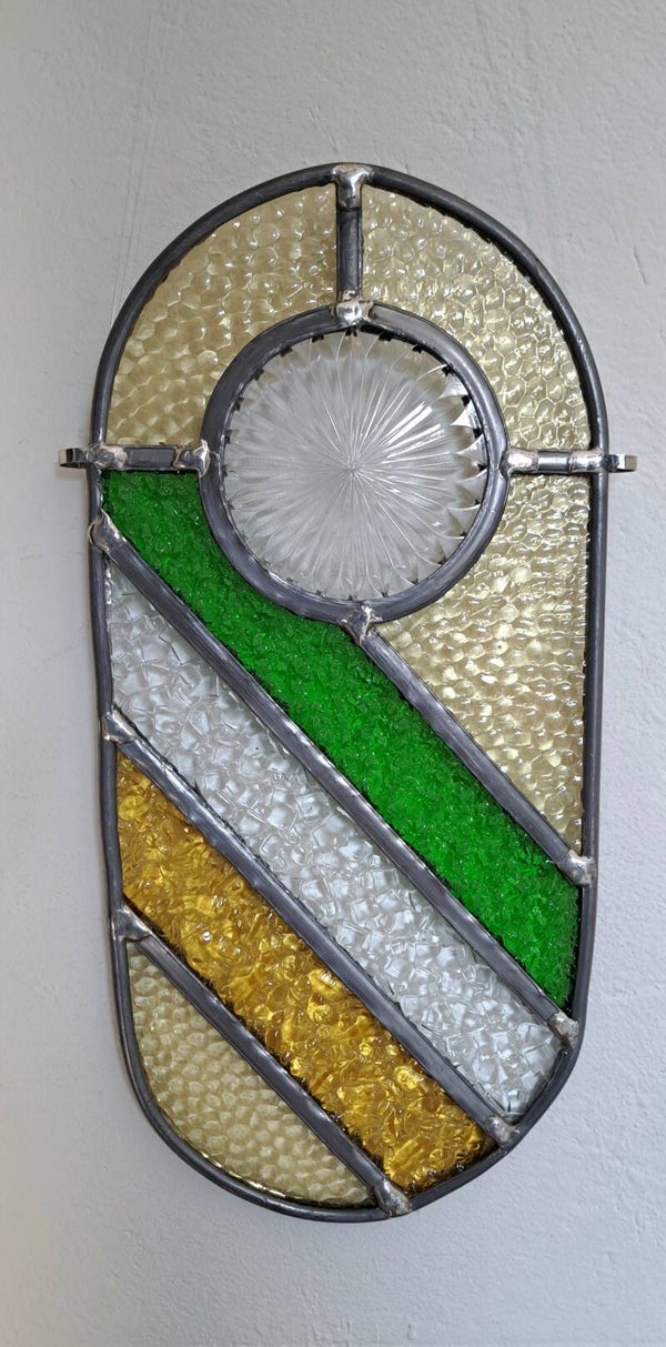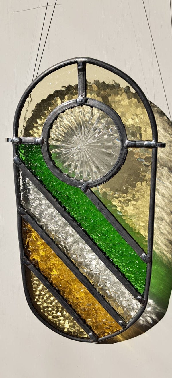 In het ronde middendeel zit een bijzonder stuk figuurglas, afkomstig uit een vintage glazen onderzetter. Dit middenstuk is zorgvuldig uitgesneden en rond geslepen en heeft een subtiel sterpatroon dat prachtig oplicht wanneer er zonlicht doorheen valt.