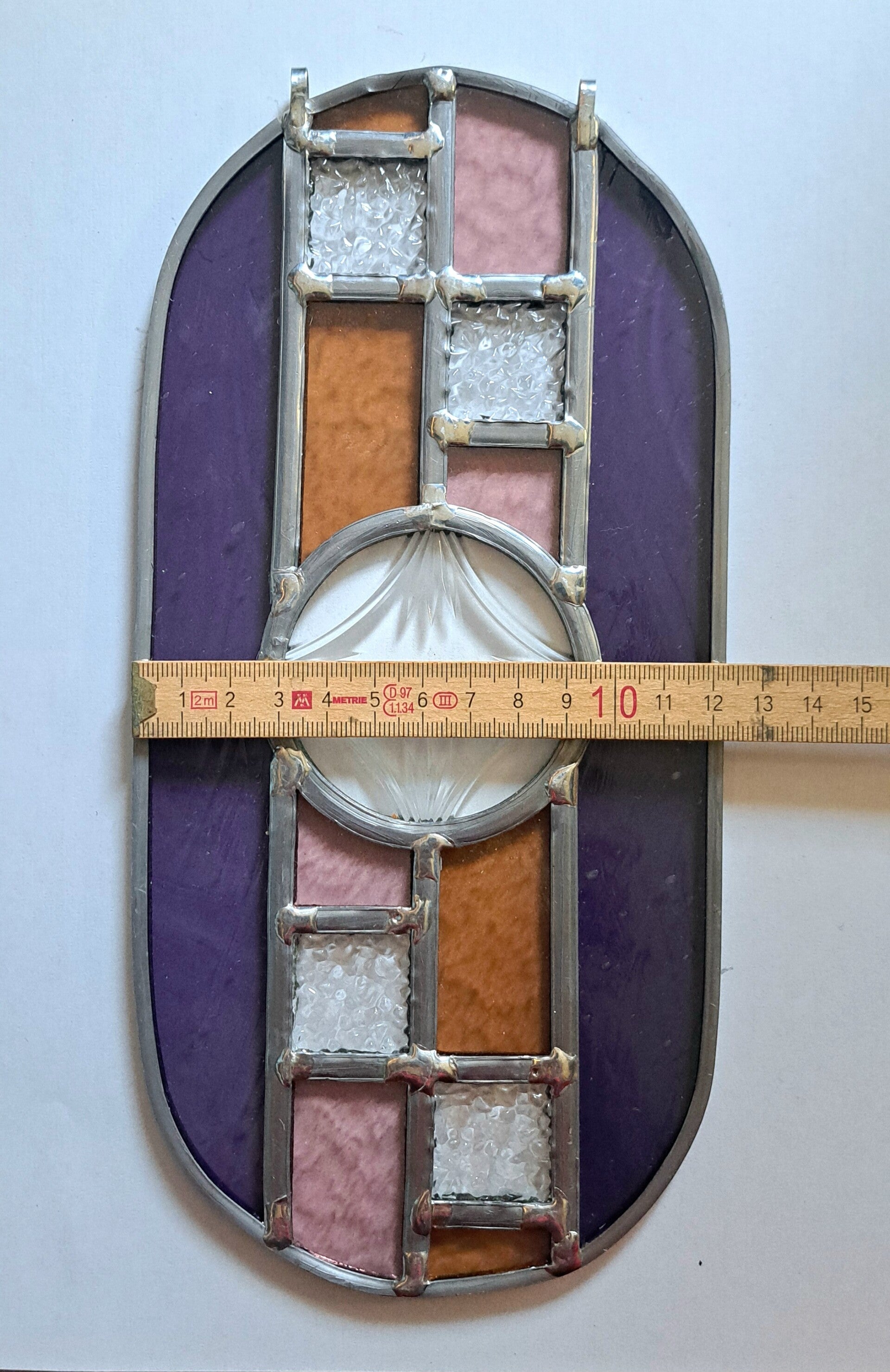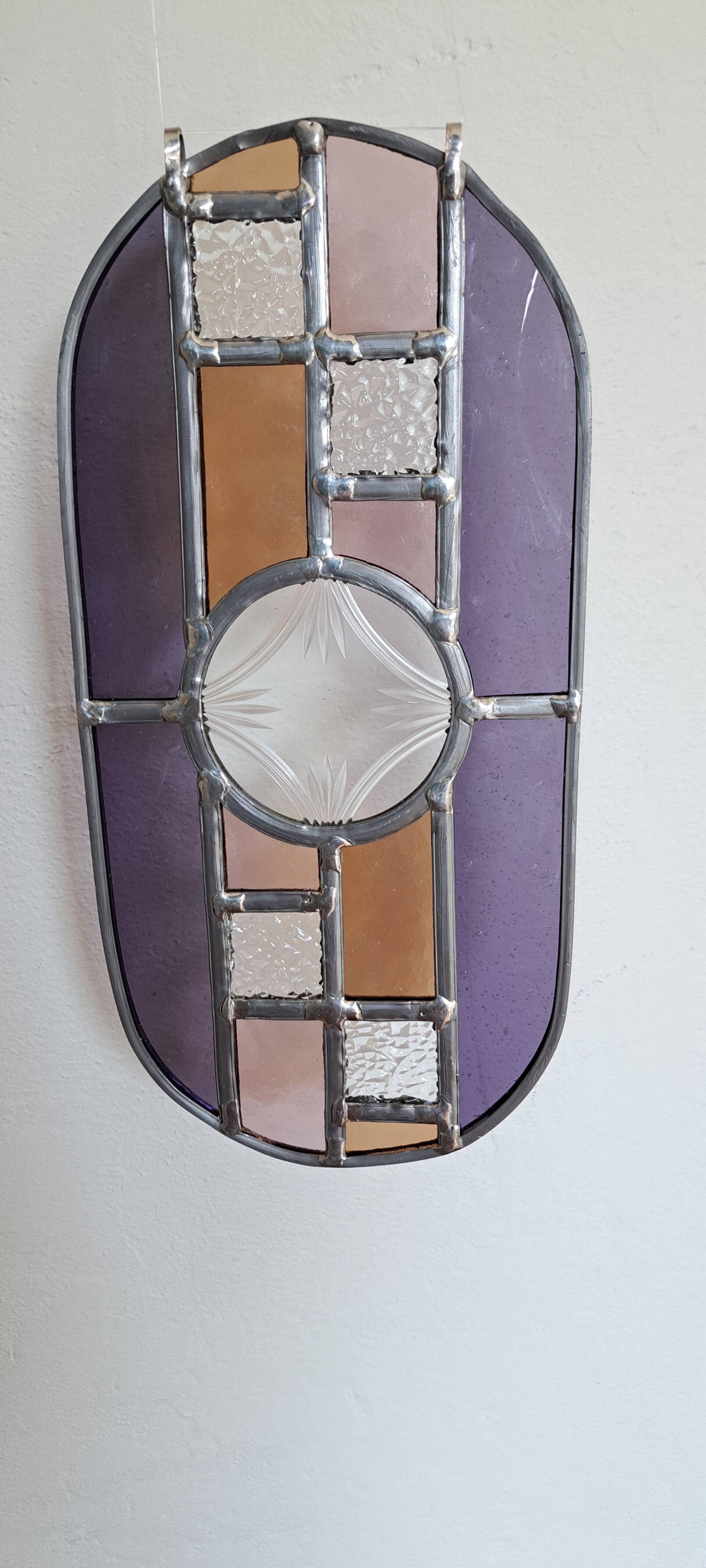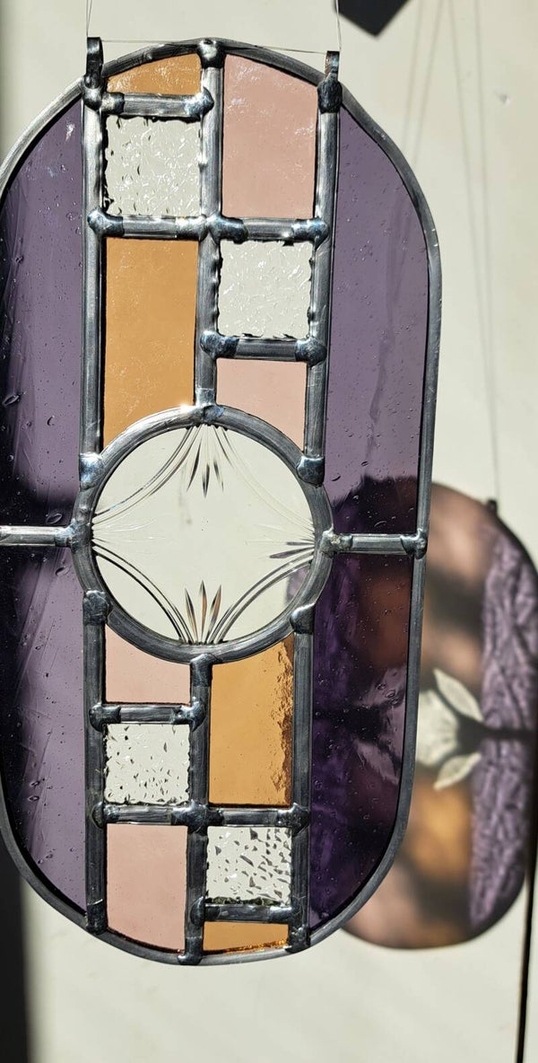 Unieke handgemaakte glas-in-lood raamhanger in een elegante ovale vorm met een abstract ontwerp.