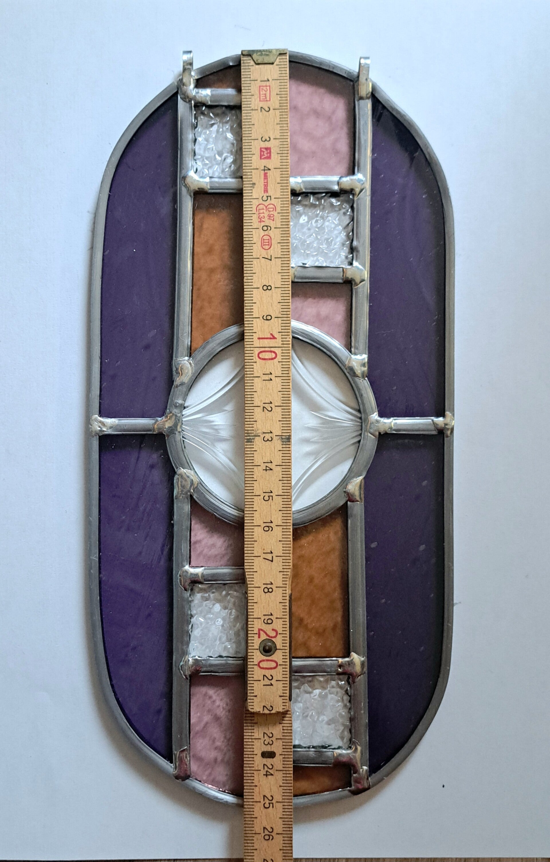 De hanger is opgebouwd uit afwisselende stukken Paars en roze en licht bruin glas, die samen een prachtig contrast vormen. Wanneer het zonlicht door het glas schijnt ontstaan er levendige kleuren en een bijzonder lichtspel in het raam.